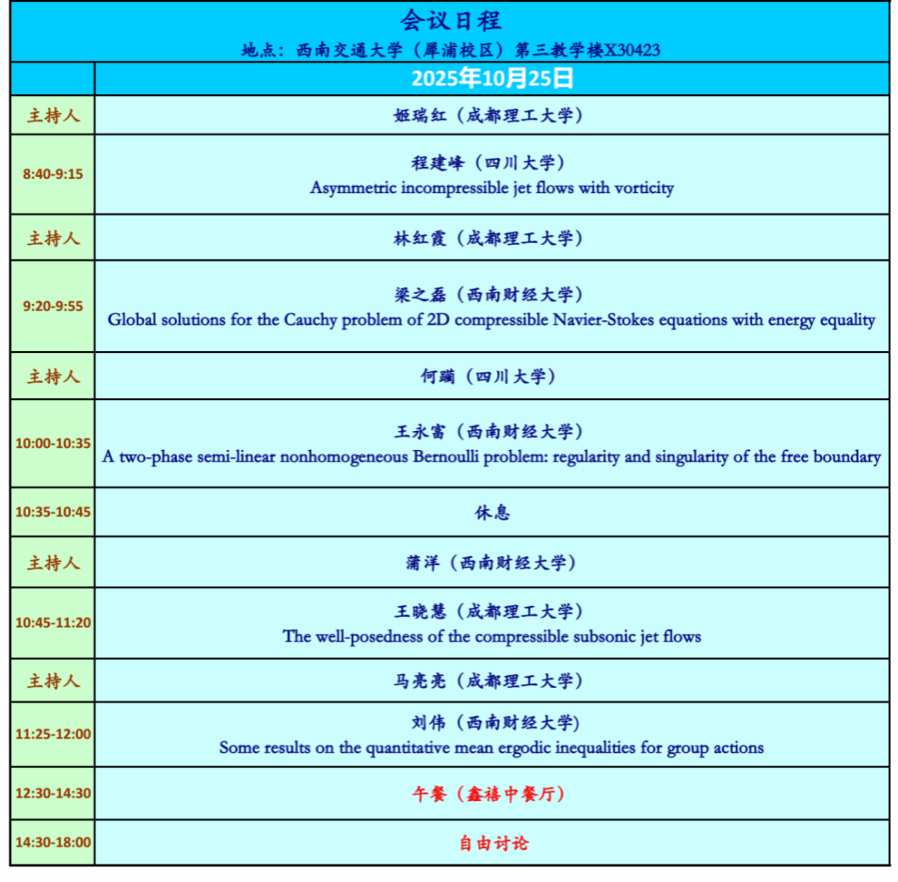 为了促进做爱直播 数学学科建设及川内同行在流体力学方程领域的学术交流,展示最新研究成果,做爱直播 主办的“2025年天府流体力学方程研讨会”将于 2025年10月25日在做爱直播 犀浦校区举办。本次会议旨在将川内流体力学方程领域的专家学者们召集起来,就当前流体力学方程领域的前沿课题及最新成果进行深入而广泛的交流,提高西部地区的学术影响力,活跃地区学术氛围。安排如下: