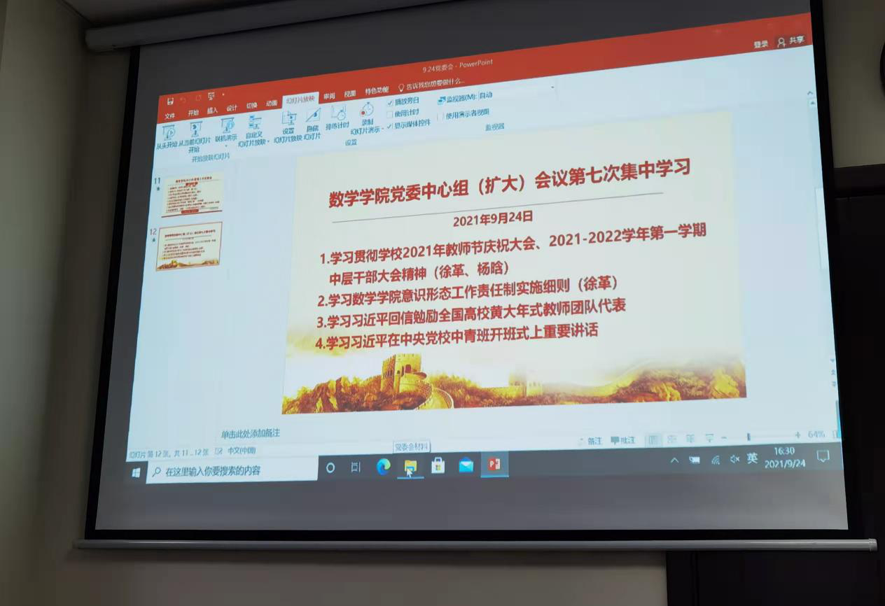 党委书记徐革主持,内容一是深入学习习近平总书记在庆祝中国共产党成立100周年大会上的重要讲话;二是传达学习学校2021年教师节庆祝大会暨2021-2022学年第一学期中层干部大会精神;三是学习《做爱直播