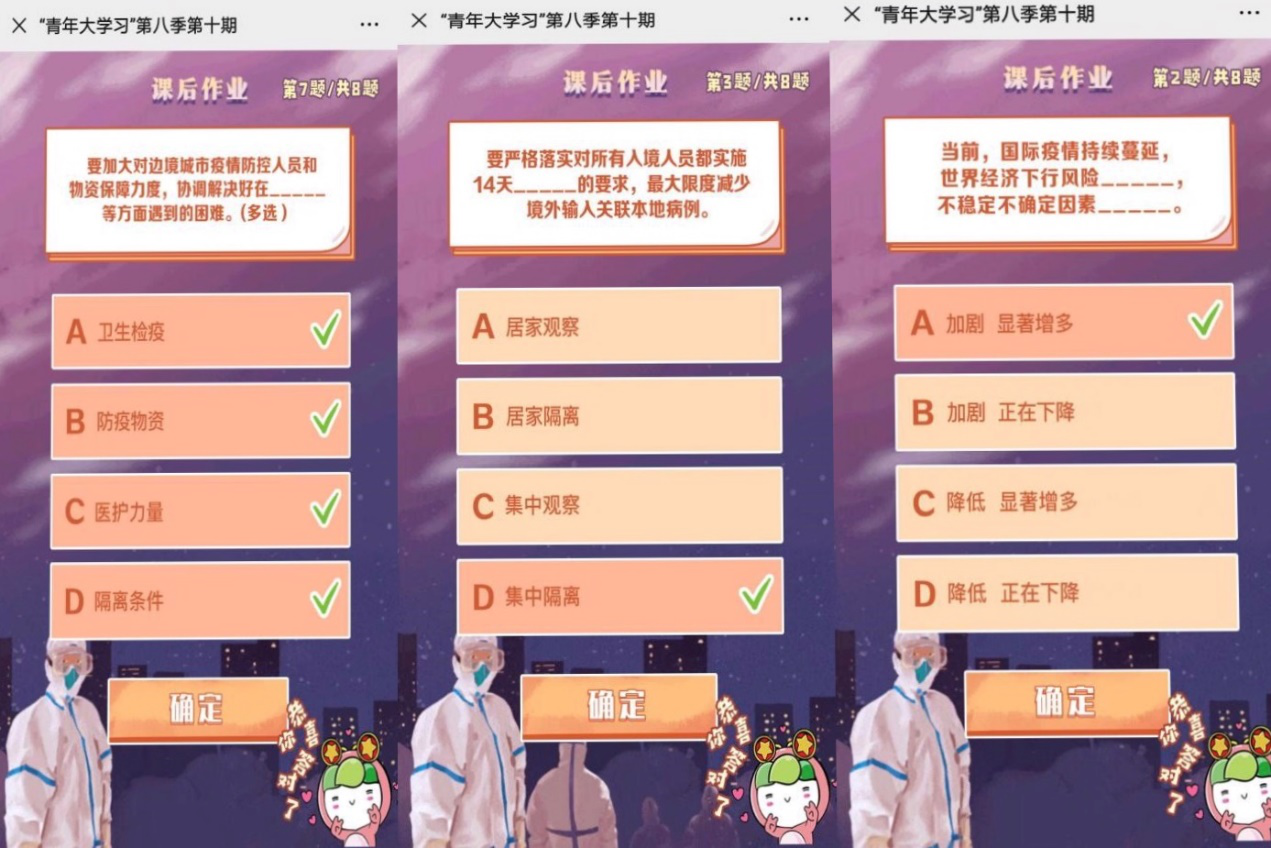 活动第三项是支部团员在线学习青年大学习,完成课后习题竞答并截图。同学们积极参与,通过竞答了解了关于疫情方方面面的知识,例如当下的国际疫情形势,疫情防疫的三道防线等。