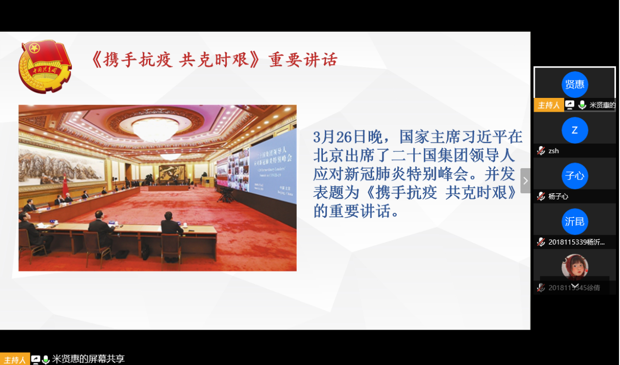活动第二项是学总书记讲话。3月26日晚,国家主席习近平在北京出席了二十国集团领导人应对新冠肺炎特别峰会,并发表题为《携手抗疫共克时艰》的重要讲话。支部团员集体学习会议精神。总书记提到,面对这一全人类的共同危机,没有任何一个国家可以独善其身,国际社会比以往任何时候都更需要团结和合作,应迅速采取协调、有力行动,有效切断疫情传播。作为共产主义青年团的一份子,支部团员也感受到了为打赢这场全球战“疫”身上义不容辞的责任。