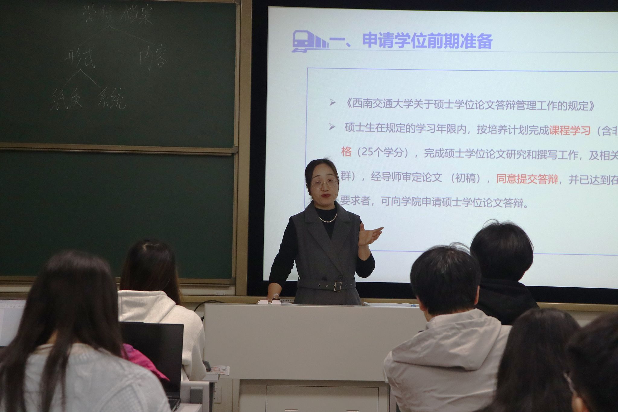 在X30404召开硕士研究生申请学位材料规范性专题讲座。讲座由学生支持办公室主任孔延花老师主讲,2026届全体硕士生参会。